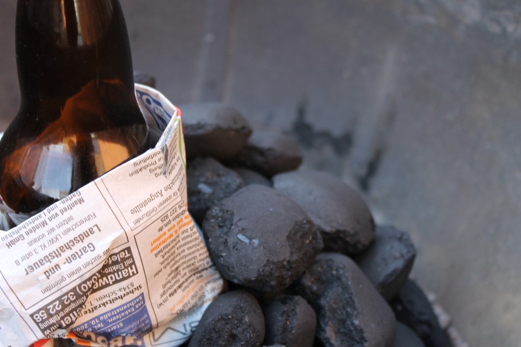 Wir nehmen dazu eine Doppelseite Zeitungspapier und wickeln sie um eine leere Bierflasche, so als wollten wir sie einpacken. Boden der Flasche und Seiten sollten fest verpackt sein, der Flaschenkopf aber frei bleiben. Wir stellen die so verpackte Flasche dann auf den Grill und legen die Grillkohlen in Form eines Vulkans um die Bierflasche. Wir nehmen dann die Bierflasche vorsichtig aus dem Krater und achten darauf, dass die Zeitung stabil zwischen Kohlen verbleibt. Wir zünden nun das Zeitungspapier im peruanischen Grillkohlevulkan an. Auf den Bildern seht ihr dann auch noch weitere spannende Projekte für den Grillabend, die ich vor Jahren für das YPS Heft sammeln durfte. Einen Grill oder Kohlekamin selber bauen? Mit Sonnenergie eine Tiefkühlpizza backen, Grillanzünder aus Wattepads herstellen oder einfach Weintrauben als Eiswürfel verwenden? Wer Ahnung oder Neugier für Naturwissenschaften hat, hat eigentlich immer genug Projekte vor sich. (Wer weitere Anregungen haben möchte muss beim Egmont Ehapa Verlag mal nach alten YPS Ausgaben fragen oder noch viel besser gleich um die Wiederauflage des Magazins bitten.)