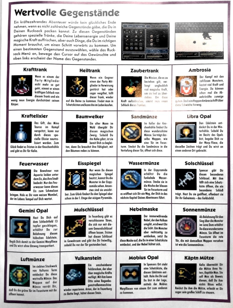 - Gegenstände zur Heilung sind sehr limitiert: Krafttrank (LP), Heiltrank (alle Zustände), Zaubertrank (MP), Ambrosia (viel LP)