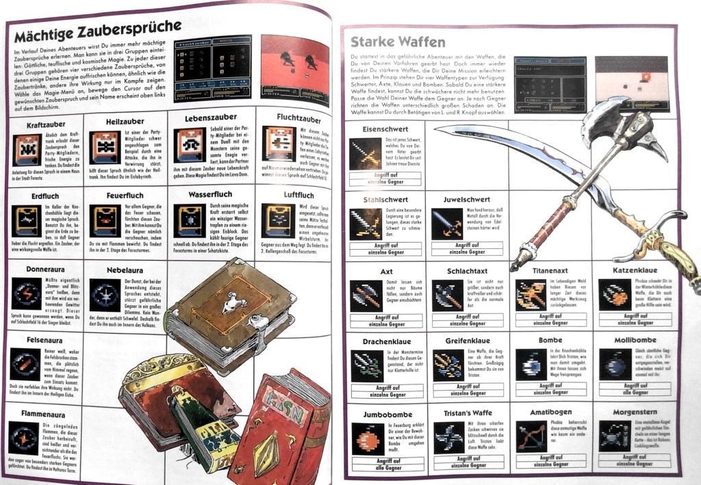 - Die Antagonisten bleiben im Spiel sehr stumm, sind also kaum in die Handlung eingebunden. Sie sind einfach „gefährliche Gegner“. Selbst der Dämonenkönig bleibt wortkarg. „Im Kampf verwandelt er sich gern in Monstergestalten“ sagt der Spieleberater, doch warum erfahren wir ebenso wenig, wie den Grund für seinen Ärger und seine Machtgier. Das mag zu Recht stören gibt aber auch Platz für kindliche Phantasie die Geschichte selber weiter zu erzählen. Damals war das Angebot an Unterhaltung noch dünn genug, dass wir als Kinder durchaus Zeit fanden die Geschichten im Sandkasten, im Garten oder auf dem Spielplatz weiter zu spielen. Ich erinnere auch eine eigene Zeldastory, die ich mal geschrieben habe, aber das ist ein anderer Beitrag.