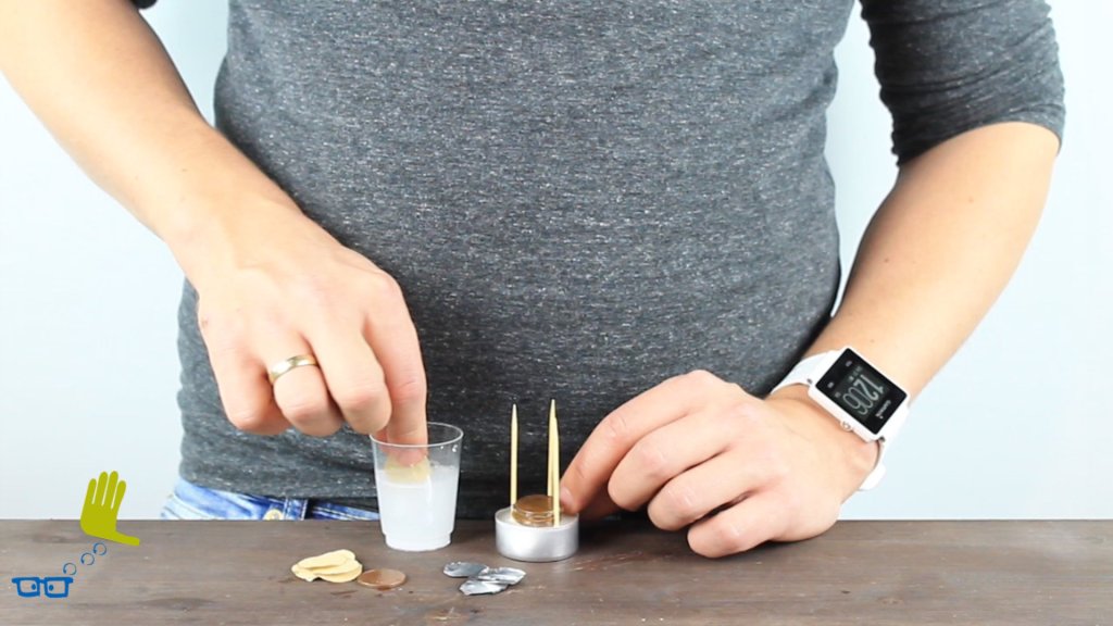 Mit Münzen, Kaffeefiltern und Alufolie erzeugen wir Strom für eine Leuchtdiode.