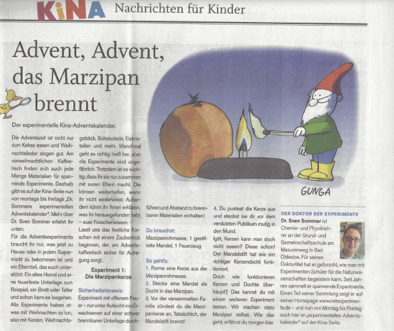 S.Sommer: Experimentier-Adventskalender, Naturwiss. Experimente für die Vorweihnachtszeit. In Flensburg: sh:z Schleswig-Holsteinischer Zeitungsverlag.